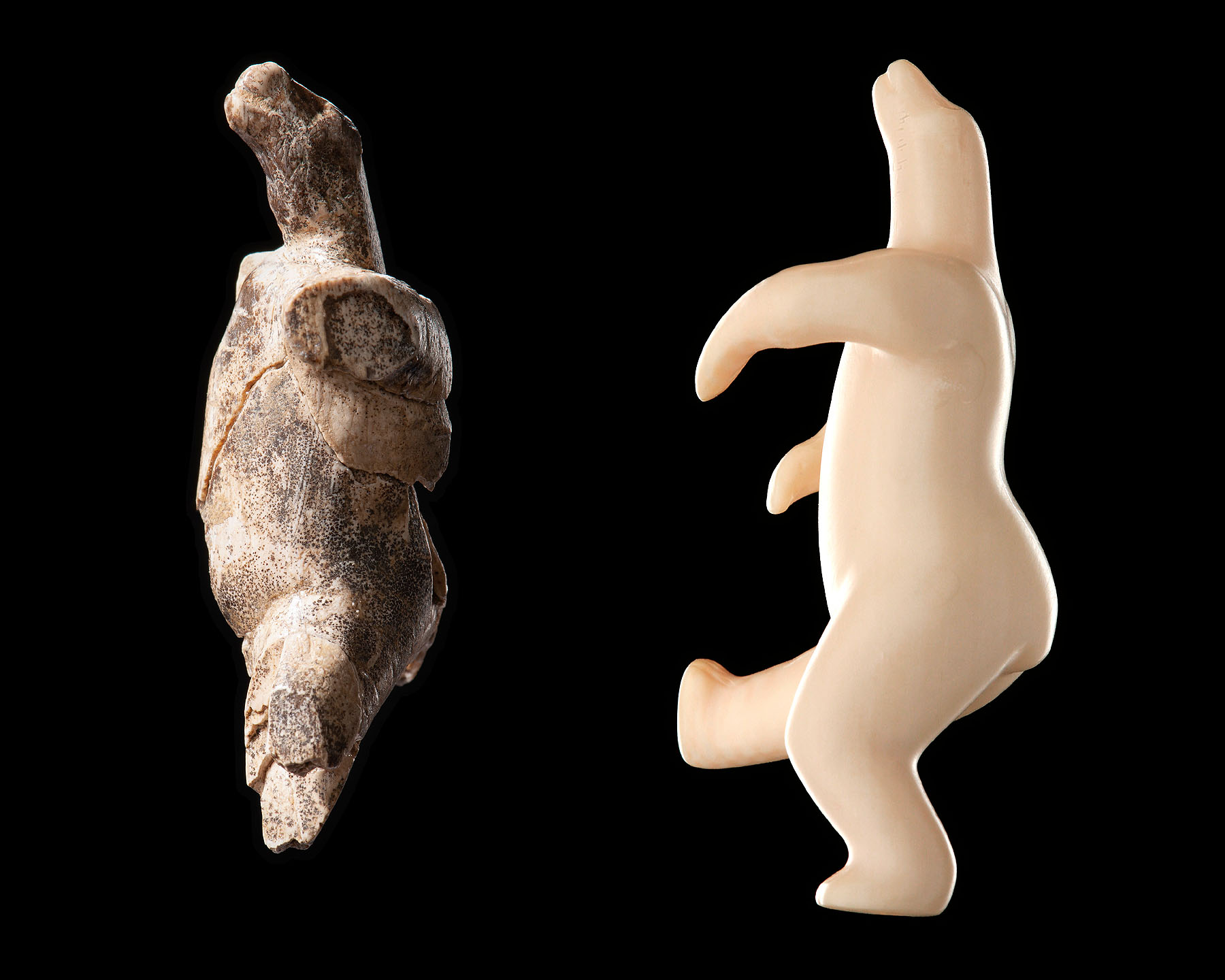 Bildcollage: Original und nachgeschnitzte Rekonstruktion des eiszeitlichen Bären aus dem Geißenklösterle bei Blaubeuren; Bildcollage und Foto Figur links: Landesmuseum Württemberg, Stuttgart, Jonathan Leliveldt; Foto Figur rechts: Thomas Gelfort, Dieburg.