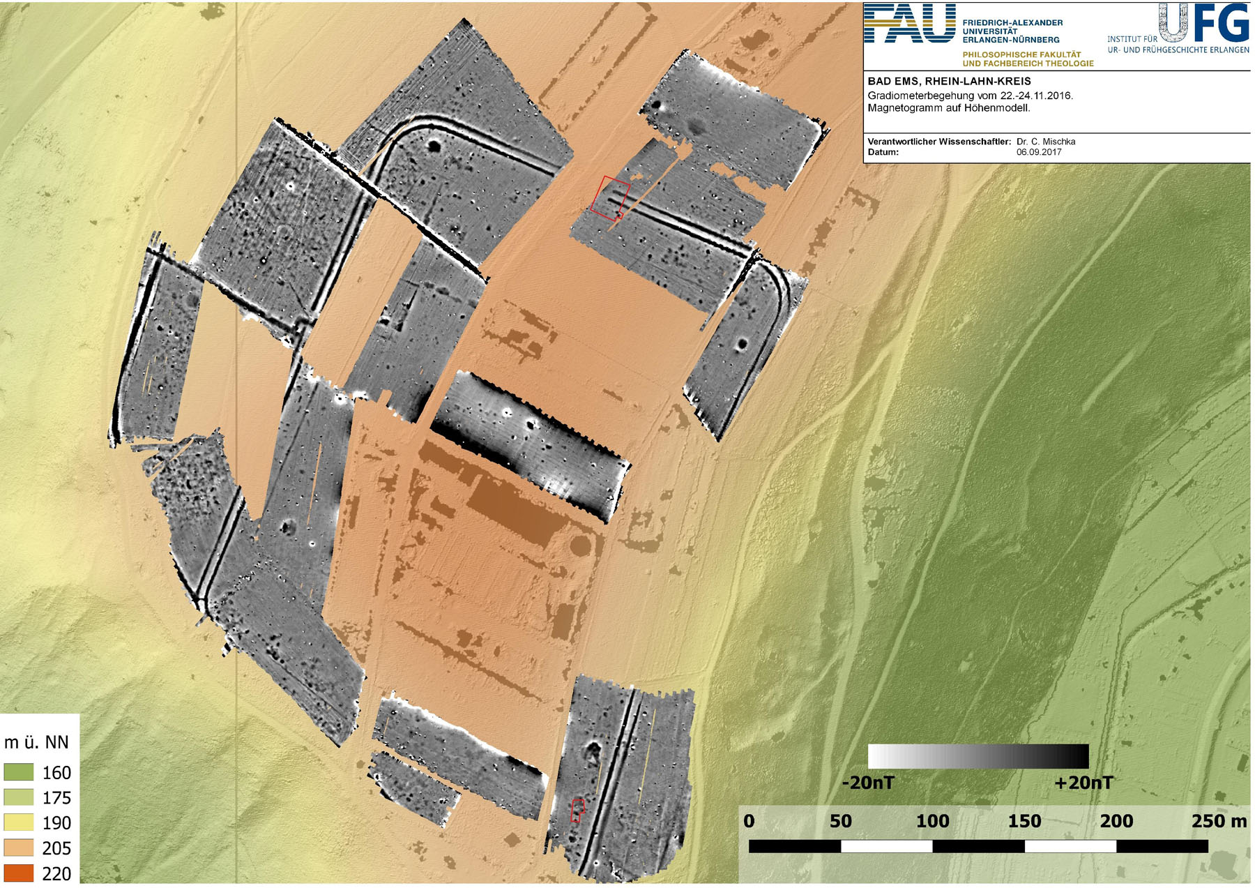 Zwei Militärlager hat es in der Umgebung von Bad Ems dies- und jenseits des Emsbachtals gegeben, beide waren bis vor kurzem unbekannt – bis das Areal in den Blick der Frankfurter Archäologen und von Dr. Peter Henrich von der Generaldirektion Kulturelles Erbe Rheinland-Pfalz rückte. Auslöser für diese Grabungen waren die Beobachtungen eines Jägers, der im Jahr 2016 von seinem Hochsitz aus Farbunterschiede im Getreidefeld entdeckte, die auf Strukturen unter der Oberfläche hindeuteten. Ein Drohnenfoto von der Erhebung, die den schönen Namen „Ehrlich“ trägt, bestätigte: Den Acker durchzog eine Spur, die von einem riesigen Traktor hätte stammen können. In Wirklichkeit handelte es sich jedoch um einen doppelten Graben, der ein römisches Lager umrahmte. Die geomagnetische Prospektion schließlich zeigte ein acht Hektar großes Militärlager mit rund 40 Türmen aus Holz. Die archäologischen Grabungen, die in zwei Kampagnen unter der örtlichen Leitung von Dr. Daniel Burger-Völlmecke durchgeführt wurden, brachten weitere Details hervor: Das Lager, das offenbar solide gebaut werden sollte, wurde nie fertiggestellt. Nur ein festes Gebäude, ein Speicher und Magazinbau, befand sind dort. Die wahrscheinlich um 3000 Soldaten mussten wohl in Zelten schlafen. Brandspuren zeigen, dass das Lager nach wenigen Jahren niedergebrannt worden war. Aber warum?