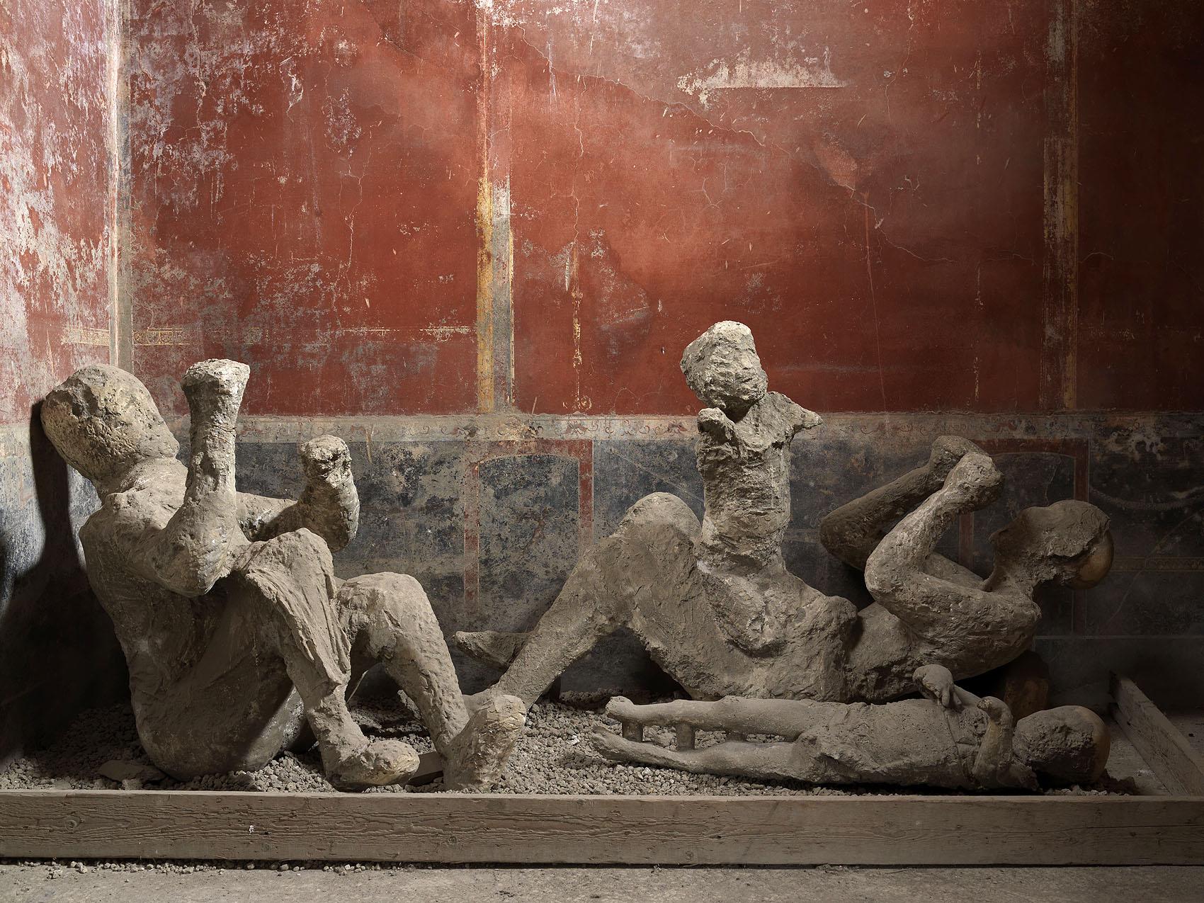 Gruppe von Abgüssen aus dem Haus des Goldenen Armbands. Abgüsse Nr. 50-51-52, Entstehungsjahr 1974. © courtesy of Archaeological Park of Pompeii Im Jahr 79 n. Chr. ereignete sich einer der schwersten Ausbrüche des Vesuvs, bei dem die römische Stadt Pompeji und ihre Bewohner unter einer dicken Schicht aus kleinen Steinen und Asche, den so genannten Lapilli, begraben wurden. Viele Einwohner Pompejis kamen ums Leben, als ihre Häuser unter der Last der aus mehreren Kilometern Höhe herabfallenden Lapilli einstürzten. Diejenigen, die die erste Phase des Ausbruchs überlebten, erlagen schließlich den gefährlichen pyroklastischen Strömen. Der sich schnell bewegende Strom aus heißen Gasen und vulkanischem Material hüllte ihre Körper sofort in eine feste Ascheschicht ein und konservierte sie wirkungsvoll, einschließlich ihrer Gesichtszüge.