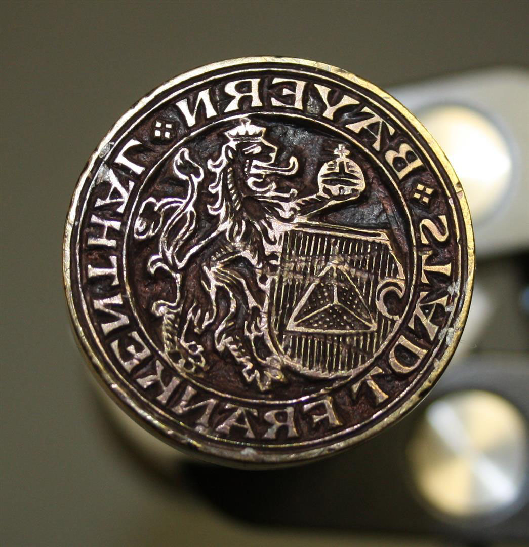 Wandlungen wie diese bedingen, dass Stadtsiegel im Laufe der Zeit gelegentlich geändert werden müssen, um geschichtlichen und politischen Umständen Rechnung zu tragen. Die Siegel sind damit wichtige Zeugnisse der Stadtgeschichte, die die Zugehörigkeiten und Rechte einer Stadt von der ersten nachweisbaren Verwendung des Siegels bis zum heutigen Tag dokumentieren. Das Siegel aus der Bayernzeit besteht aus einem Siegelstock aus Messing mit 3,1 cm Durchmesser und einem ca. 12 cm langen Holzgriff.