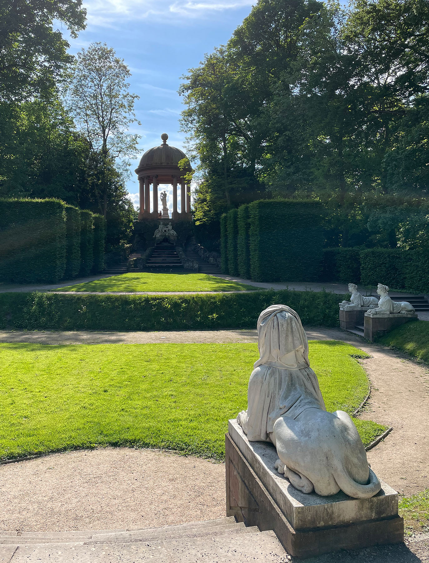 Schlossgarten Schwetzingen, Freilufttheater mit Sphinx und Apollotempel.