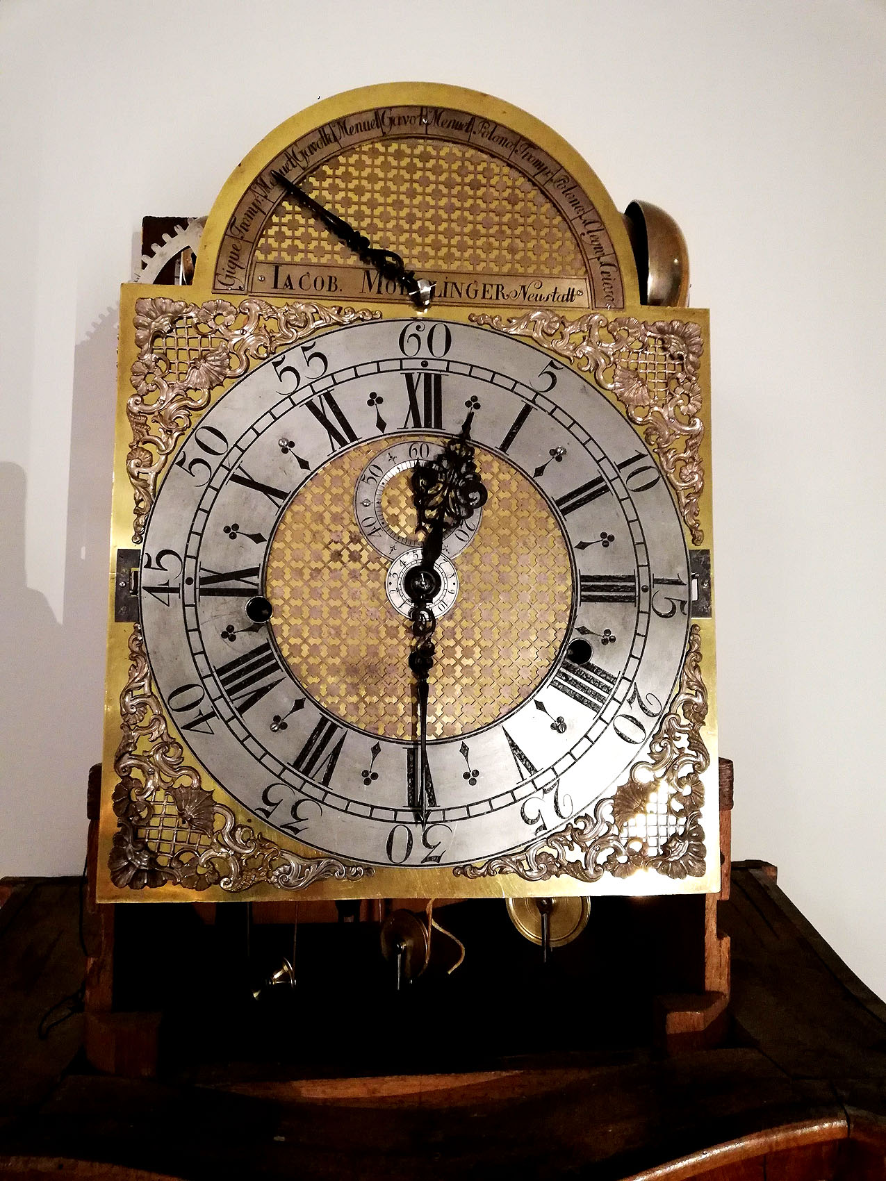 Das historische Glockenspiel aus der Zeit des Barocks wird von Christian Schnurbus gestellt. Der Uhrmachermeister und Restaurator für historische Uhren hat die technische Meisterleistung gereinigt und restauriert, als die Staatlichen Schlösser und Gärten Baden-Württemberg sie 2020 erwarben. Die Uhr imponiert nicht nur durch ihr Äußeres – sie ist fast 2,80 Meter hoch und mit kostbaren Einlegearbeiten aus unterschiedlichen Hölzern verziert –, sondern auch durch ihre technische Raffinesse. Insgesamt zwölf Melodien, die jeweils zwischen 40 und 50 Sekunden lang sind, lassen sich auf der Bodenstanduhr einstellen. 14 Glocken sorgen dabei für ein einzigartiges Klangerlebnis. Eine große Messingwalze, die quer oberhalb des Uhrwerkes gelagert ist, gibt den Ton an: Sie trägt hunderte winzige Messingstifte, die die Hämmer in Bewegung setzen und auf den Punkt genaue Melodienfolgen erklingen lassen. Kein Geringerer als der kurfürstliche Hofuhrmacher Johann Jacob Möllinger fertigte sie an – die prunkvolle Standuhr gilt als eines seiner Hauptwerke. Dieses Mal wird ein Menuett zu hören sein.