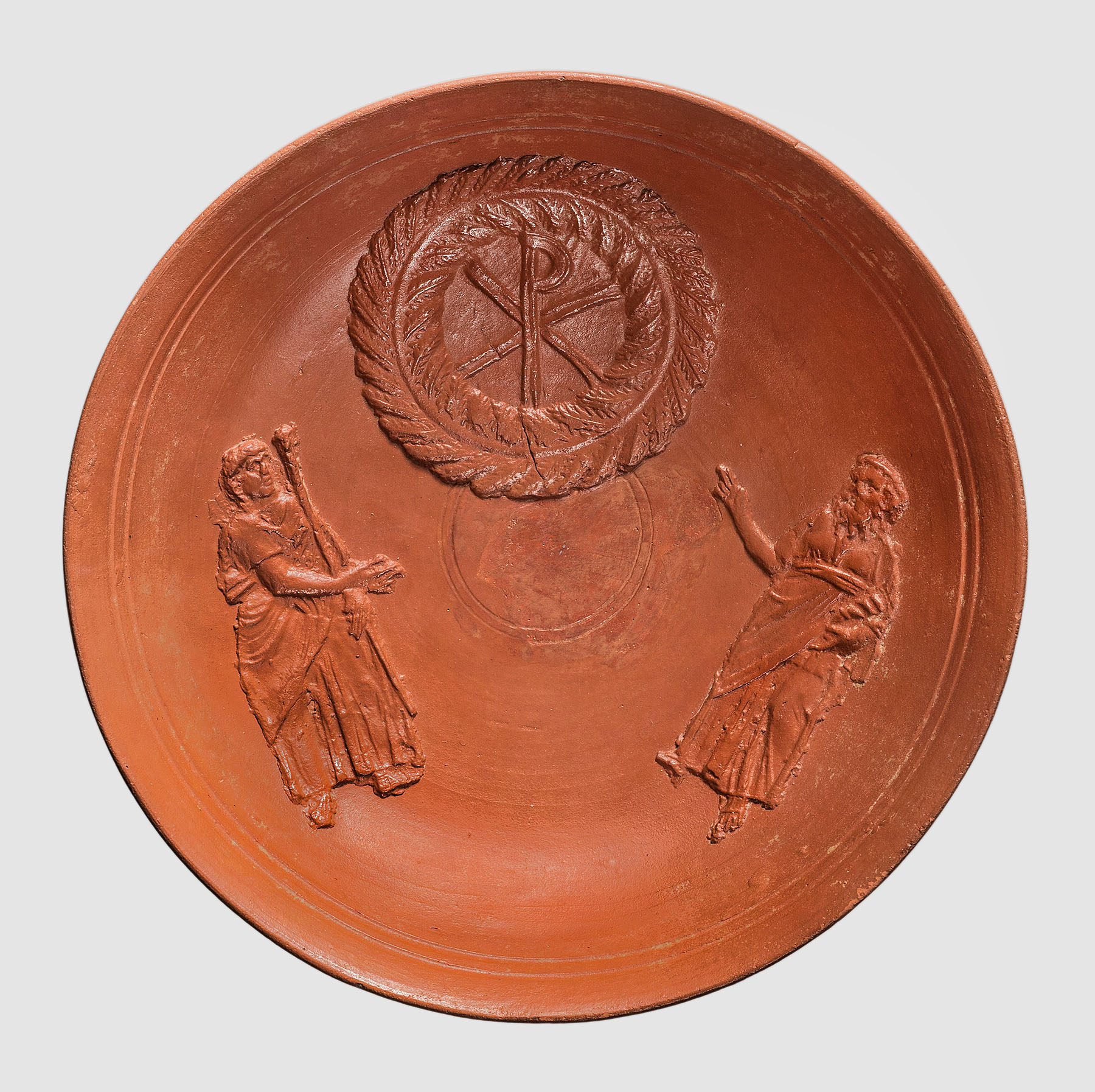 Ein mächtiges Christogramm wird auf dieser Schale flankiert von einem bärtigen Apostel (Paulus ?)
