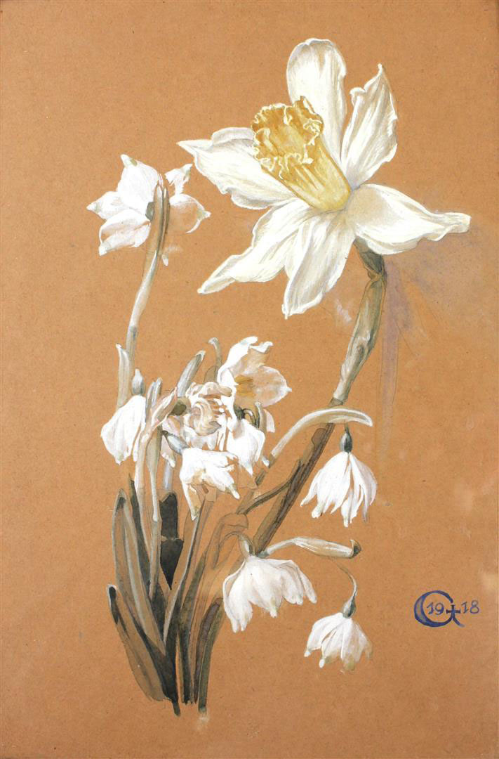 Der Frühling steht für Neuanfänge und Erneuerung, was durch das Wiedererwachen der Natur nach den kalten Wintermonaten deutlich wird. Insbesondere Narzissen und Märzenbecher sind als Frühlingsboten im Garten oder als frische Blumen für Zuhause allgegenwärtig. Sowohl Narzissen als auch Märzenbechern kann zudem eine tiefergehende Bedeutung zugeschrieben werden. Sie stehen für Hoffnung und sind eng mit dem Osterfest verbunden. Der Frankenthaler Künstler Otto Gutknecht (1892-1943) griff auf das Motiv der Frühlingsboten in einer 1918 entstandenen Blumenstudie zurück. Die naturalistische Darstellung der Blumen findet sich häufig in Werken des Künstlers und stellt eine Hommage an alte Meister wie Albrecht Dürer dar, die Gutknecht immer wieder als Inspirationsquelle dienten.