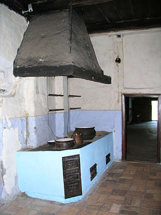 Herd mit Rauchabzug in dem um 1800 errichteten Anbau. Im Hintergrund die Diele.