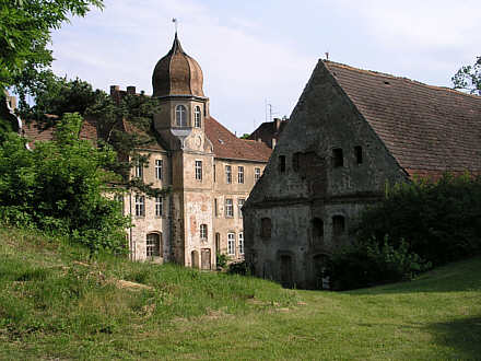 Schloss des 16. Jh., mit Aufbau des frühen 20. Jh., im Vordergrund die Wirtschaftsgebäude. Nach links der Bereich der spätgotischen Burg.
