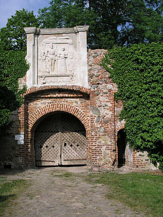Steinrelief aus der Zeit des Festungsbaus oberhalb des Tores mit der Darstellung des Grafen Ulrich l. von Schwerin im Harnisch mit seiner Gattin Anna von Arnim in Lebensgröße