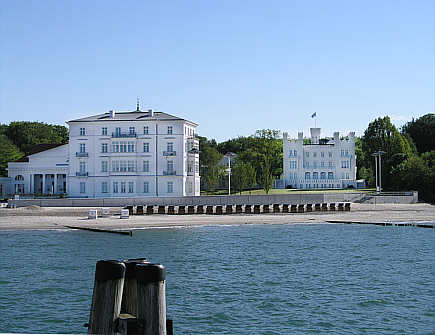 Rechts die 1840 im Tudorstil erbaute Villa für die großherzogliche Familie (1960 im Stil "versachlicht"), links der Anbau des ersten Badehauses von 1795, 1875 hinzugefügt, und das Kurhaus von 1816.