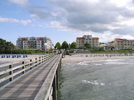 1991 als Zeichen des Wiederaufbaus nach der Wende wieder errichtet. Im Hintergrund die großen Hotels an der Strandpromenade,
