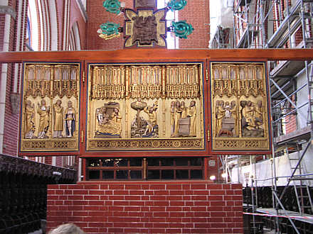 Kreuzaltar (um 1365/0), Mönchsseite (Marienseite) Links die Verkündigung und Gideon und der Engel, Im Schrein die Geburt Christi, Mode am brennenden Dornbusch und die Darstellung im Tempel, rechts die Darbringung Samuels und die Flucht nach Ägypten.