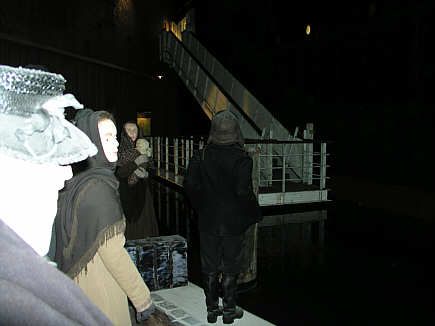 Am Kai. Wartende Menschen mit Gepäck, im Hintergrund die Gangway zum Schiffsdeck und ein erleuchtetes Bullauge