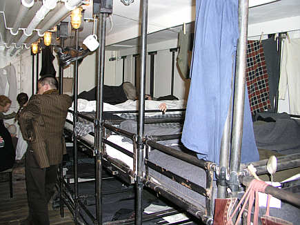 Schlafraum unter Deck eines Dampfschiffes mit Eisengestellen.