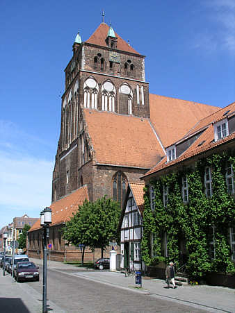 Dreischiffige Hallenkirche ohne ausgeschiedenen Chor, im letzten Viertel des 13. Jh. begonnen und vor der Mitte des 14. Jh. vollendet. Der Turm 1678 zerstört und 1780 in verkleinerter Form wieder aufgebaut. Höhe der Kirchenschiffe 21 m.
