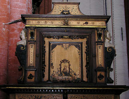 Kanzelportal Aufsatz mit Maria im Rosenhag zwischen zwei seitlichen Hermen.