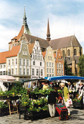 Giebelhäuser am Neumarkt, im Hintergrund der Chor von St. Marien.