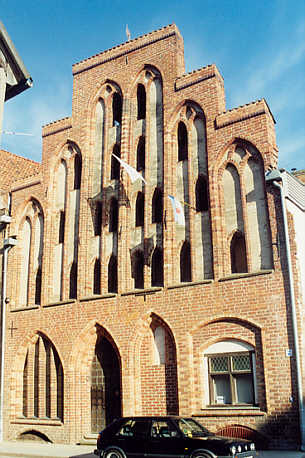 Treppengiebel mit sechs zweigeteilten Giebelblenden und spitzbogigen Luken nach barockem Umbau im 17. Jh. 1974-76 wieder hergestellt.