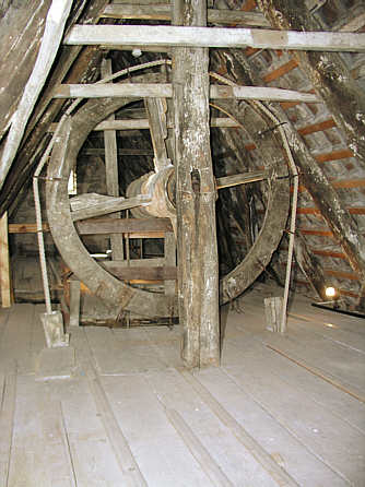 Rad des Lastenaufzugs unter dem Dachfirst. Das Rad ist noch original aus dem 14. Jahrhundert überliefert.