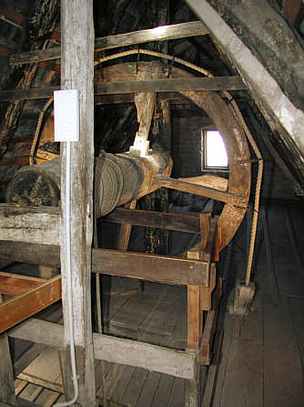 Rad des Lastenaufzugs unter dem Dachfirst.
