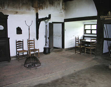 Flett des Heuerhauses mit der offenen Herdstelle, dem Kran für den Kochtopf und der rechtsseitigen Lucht ("Mansedel"), dem eingezogenen Essplatz.