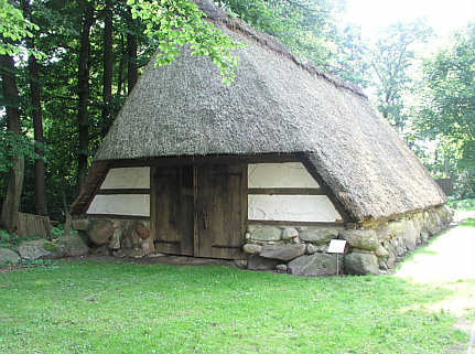 Reetgedecktes Fachwerkgebäude auf starkem einreihigem Findlingssockel. Links eine der Schenkelmauern als Abgrenzung für die einzutreibenden Schafe.