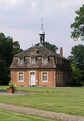 Die Schlosskirche unterscheidet sich in der Frontgestaltung allenfalls durch den aufgesetzten Dachreiter von den übrigen Pavillons. Erst in der Seitenansicht zeigt sich die Tiefe des angeschlossenen Konventsbaus.