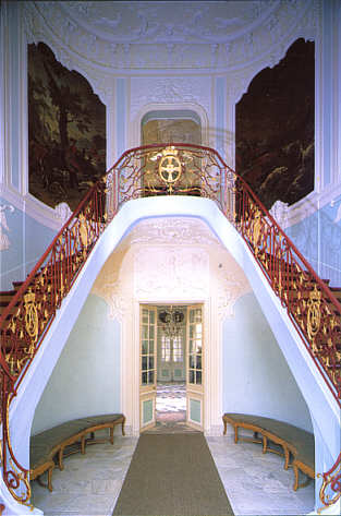 Treppenhaus Aus Konzeptions- und Platzgründen schwingt sich die doppelläufige Treppe sehr steil im wesentlichen Risalit nach oben