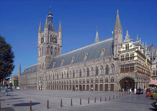 Wahrzeichen der Stadt Ieper (frz. Ypres, dt. Ypern) ist die große Tuchhalle als Marktplatz mit dem Belfried. Sie ist eines der größten gotischen Gebäude Europas und wurde 1200 - 1304 als Lager- und Verkaufshalle für die hier hergestellten flandrischen Tuche errichtet. In der Mitte der Fassade steht der 70 m hohe Belfried, das einstige Symbol für die Macht und Stärke des Bürgertums der Stadt.
