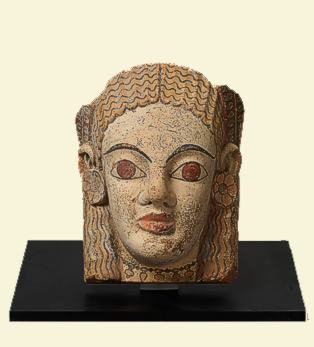 Der idealtypische Mädchenkopf mit seinen weit geöffneten, mandelförmigen Augen und den vollen Lippen ist reich mit Ohrringen, einem Diadem und einer Halskette geschmückt. Das Antefix zierte einst das Dach eines Tempels oder eines anderen repräsentativen Gebäudes.