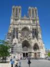 Die Kathedrale glorifiziert das Königtum. Das Gebäude wird an der Fassade, der Türmen und an den beiden Querschifffassaden von einer Galerie von 56 Statuen von Königen, jede viereinhalb Meter hoch, umzogen. Die Mitte der Westfassade nimmt dabei König Chlodwig im Taufbecken, flankiert von seiner Gemahlin Chlothilde und dem Reimser Bischof, dem heiligen Remigius (St. Remi) ein. Diese zentrale Botschaft christlicher Legitimation wird eingerahmt von einem Ritter, der des Königs Kleider über dem Arm trägt, sowie von einem Diakon mit Vortragekreuz.