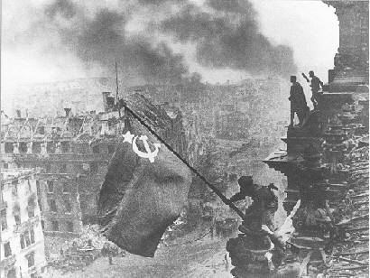 | In der Stunde des Sieges ? Sicher nicht. Das Bild entstand Tage später, als die Rote Armee einen Dokumentarfilm über die Einnahme Berlins drehte. Die Rauchwolken sind deutlich nachträglich draufmontiert. Es gibt allerdings ein Originalbild von dieser Szene. |