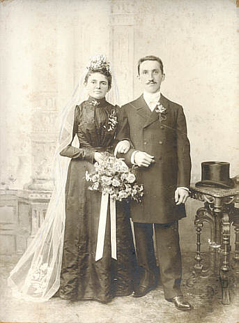 Großmutter in einem schwarzen Hochzeitskleid, vermutlich aus Seide, Großvater im klassischen Gehrock