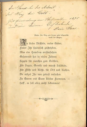 | handschriftlich: Die Hand bei der Arbeit - Das Herz bei Gott. Zur Erinnerung an Weihnachten 1895 und an deine dich liebende Marie Haas Großmutter war damals gerade 17 Jahre alt |
